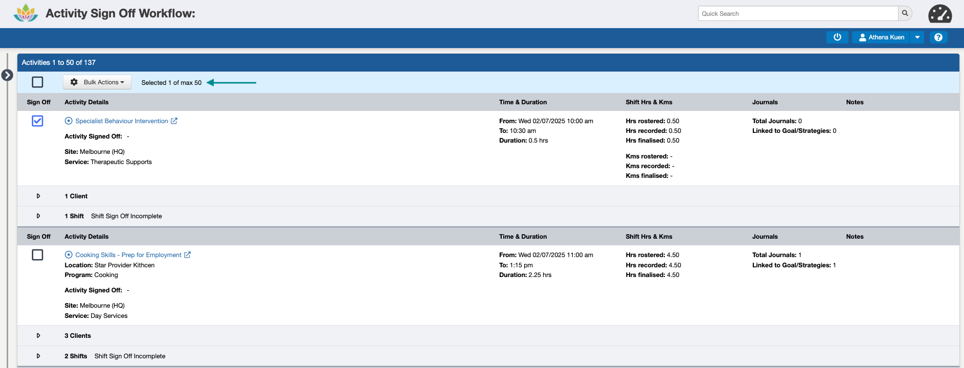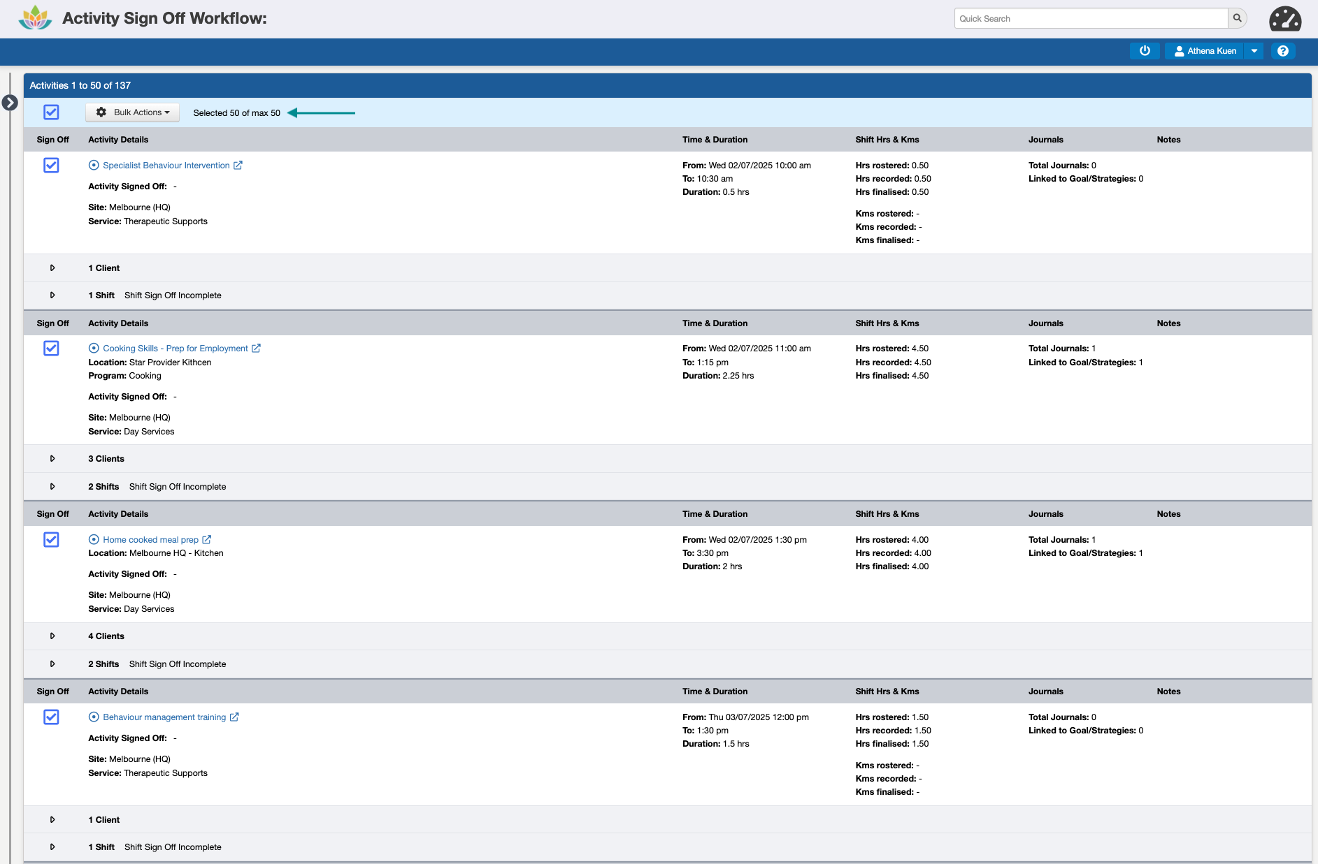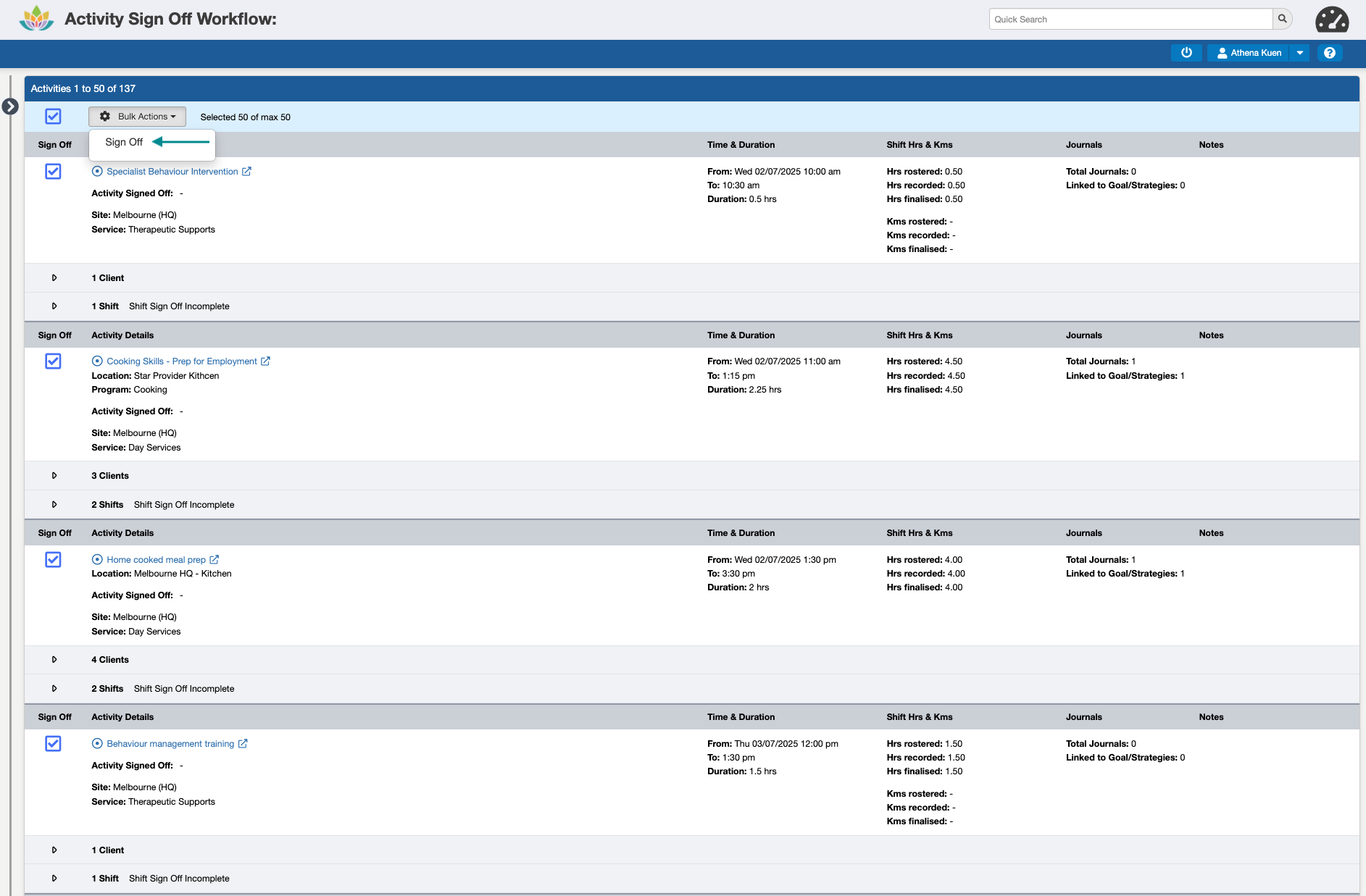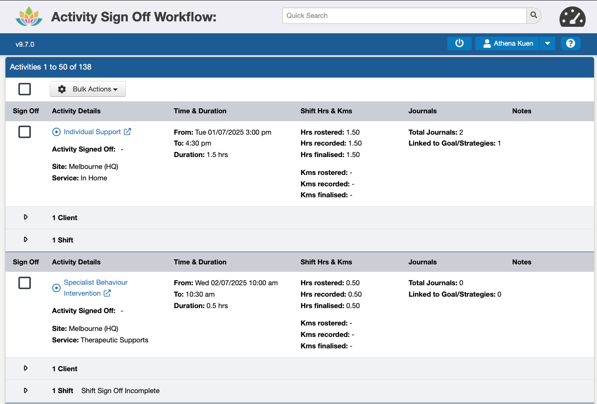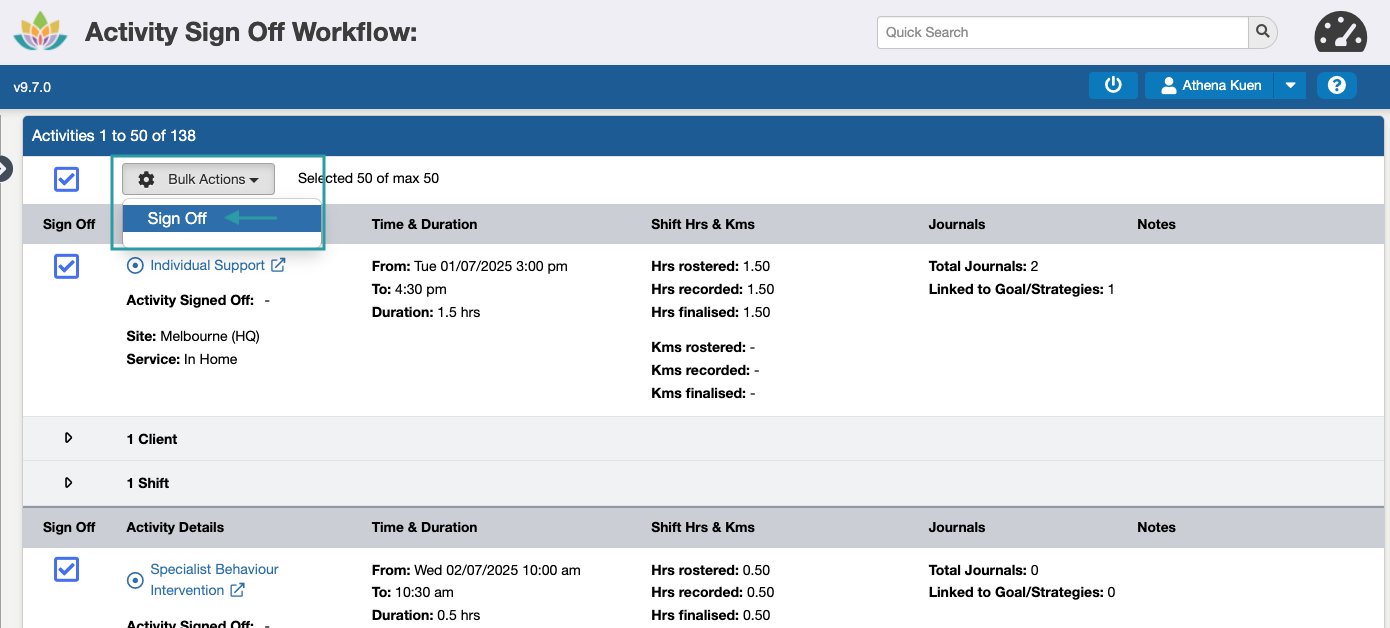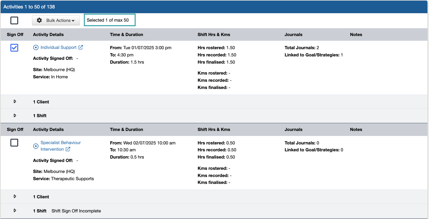 While more than one Activity can be Signed Off at a time (up to a limit of 60 at a time), we recommend completing this in smaller batches, e.g. 10-20, to make sure all of the required information is reviewed before approving them for invoicing, claiming, and payroll.
