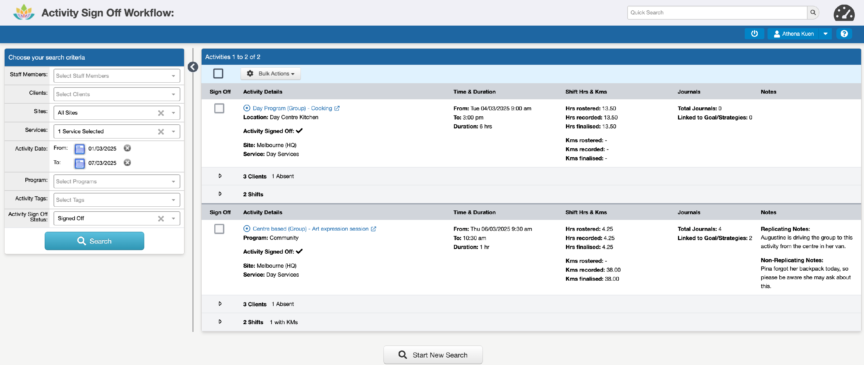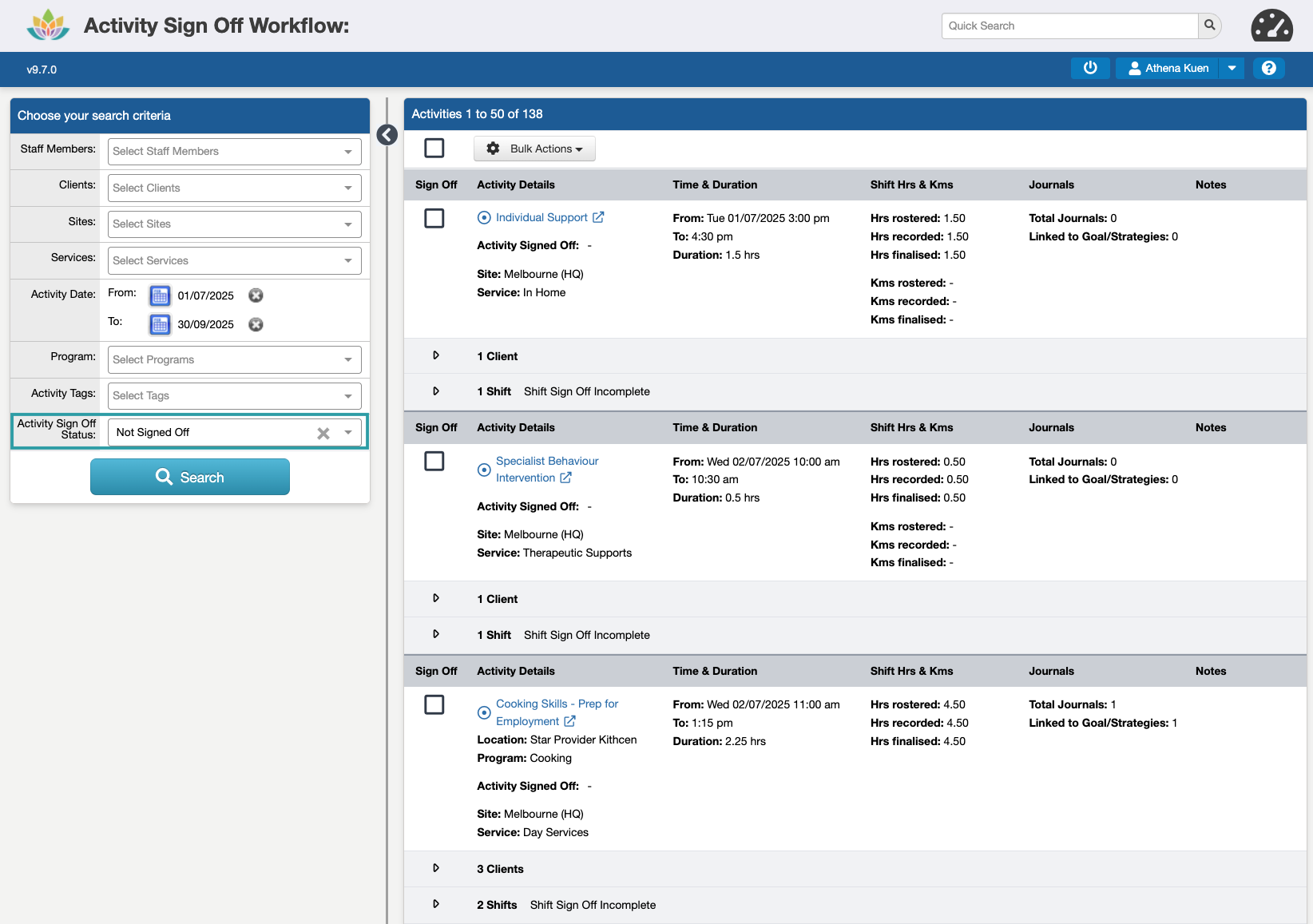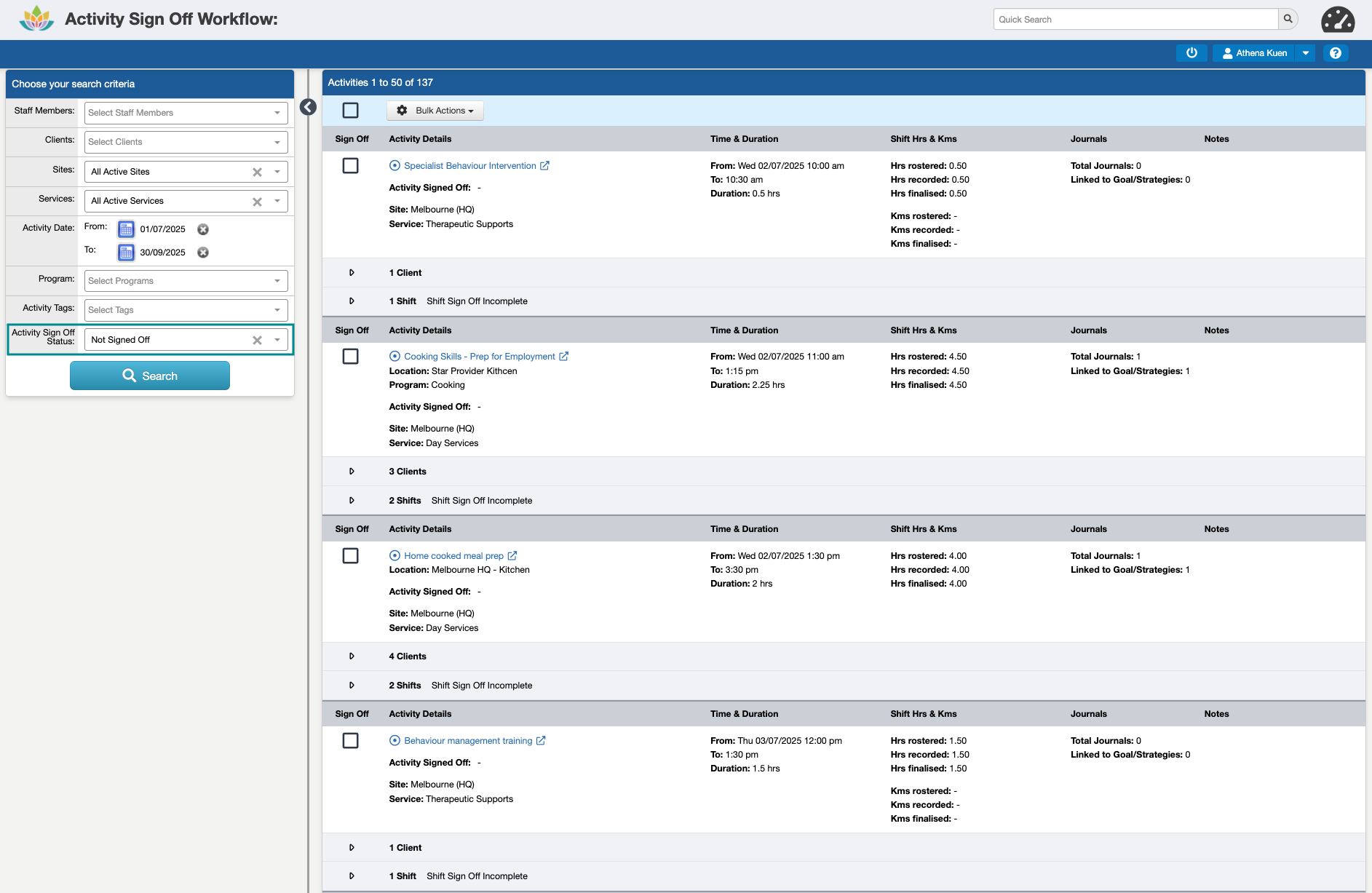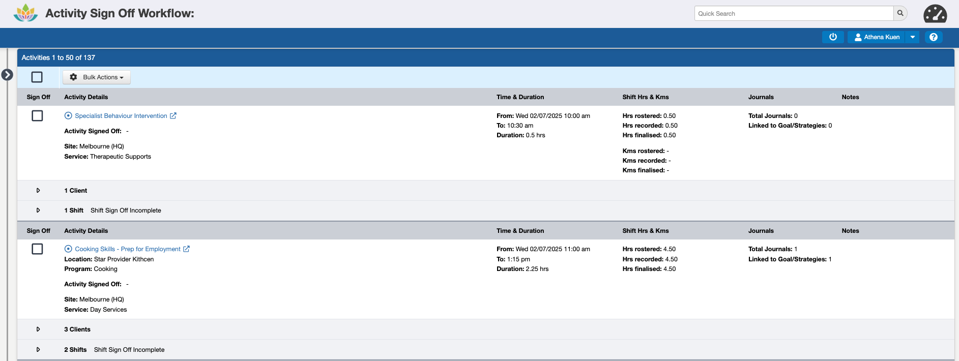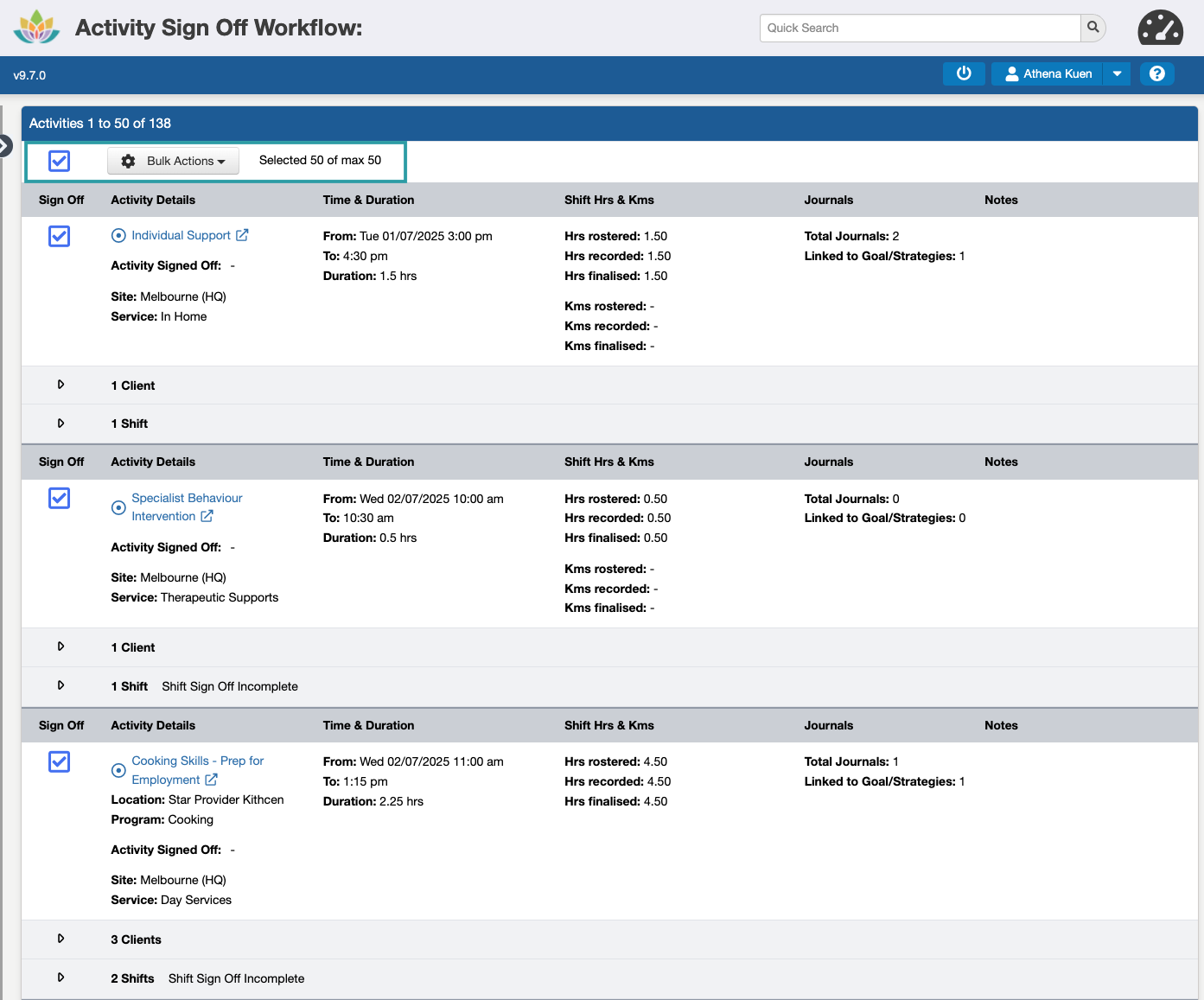 While more than one Activity can be Signed Off at a time (up to a limit of 60 at a time), we recommend completing this in smaller batches, e.g. 10-20, to make sure all of the required information is reviewed before approving them for invoicing, claiming, and payroll.