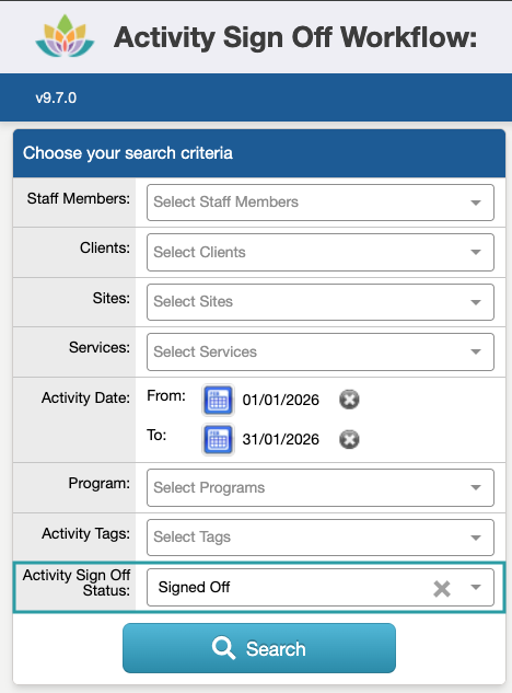 To review the Activities that have been Signed Off, you can update the 'Activity Sign Off Status' filter to 'Signed Off' and select Search: