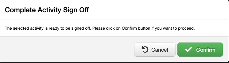 By selecting 'Confirm', the Activity Sign Off is completed for the Activities that can be Signed Off, and the Activities that could not be Signed Off are tagged as 'Under Review'.