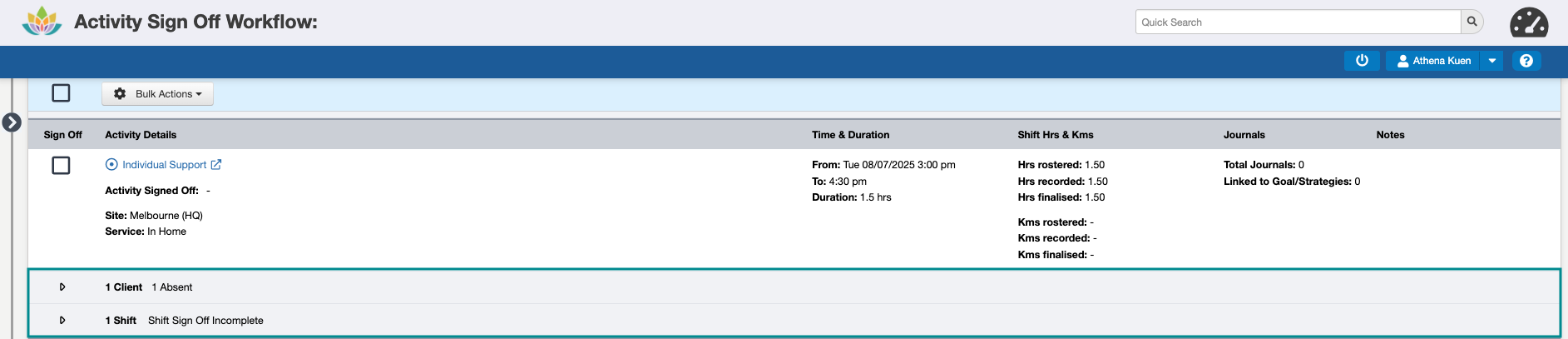 The Activity Sign Off Workflow feature available from SupportAbility v8.14 (March 2025) allows you to review Activity data holistically and complete the necessary checks prior to finalising the Activity for invoicing, claiming, and payroll by completing the Activity Sign Off.
