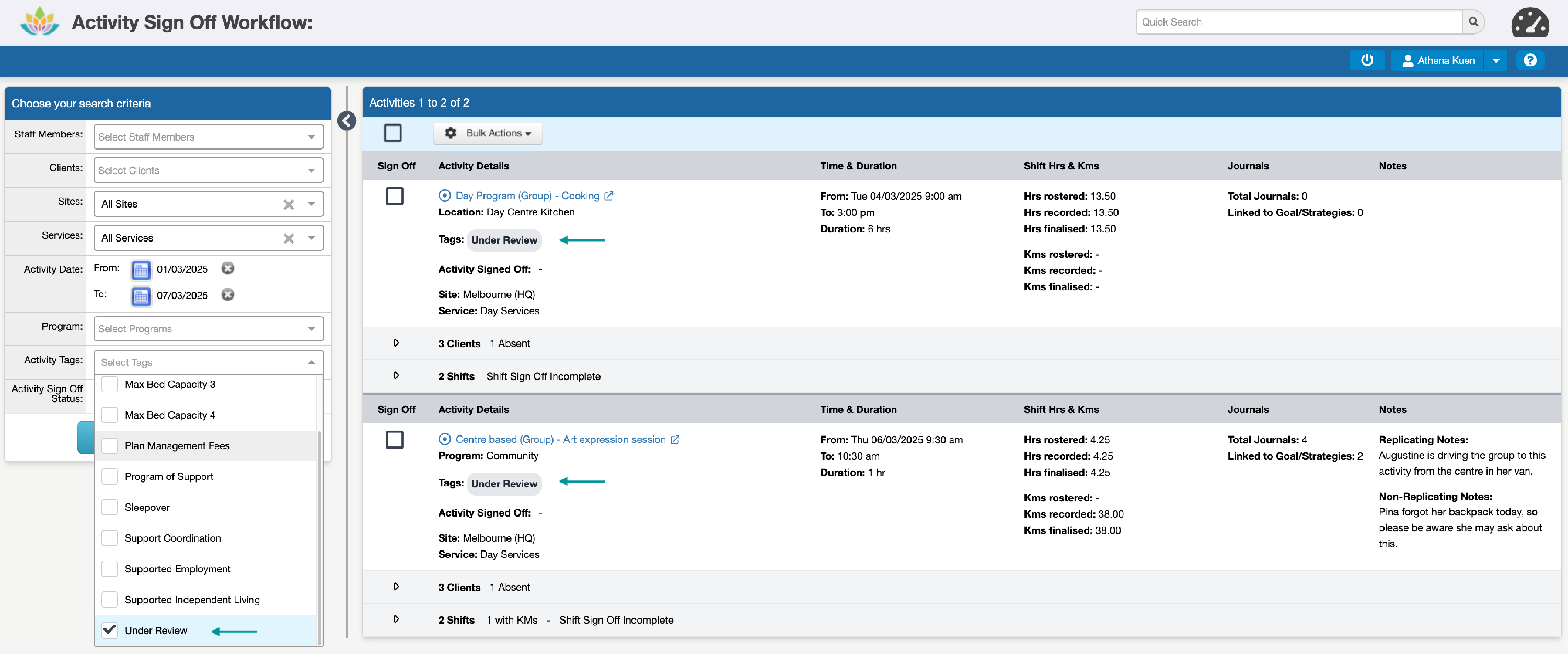 Any Activities that could not be Signed Off are automatically tagged as 'Under Review' to assist in identifying this: