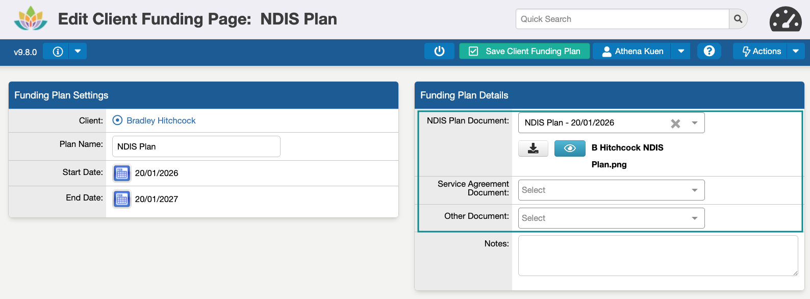 The Funding Plan record now includes a Funding Plan Details section that lets you link key client documents and add notes relevant to the participant's NDIS Plan or Service Agreement.
