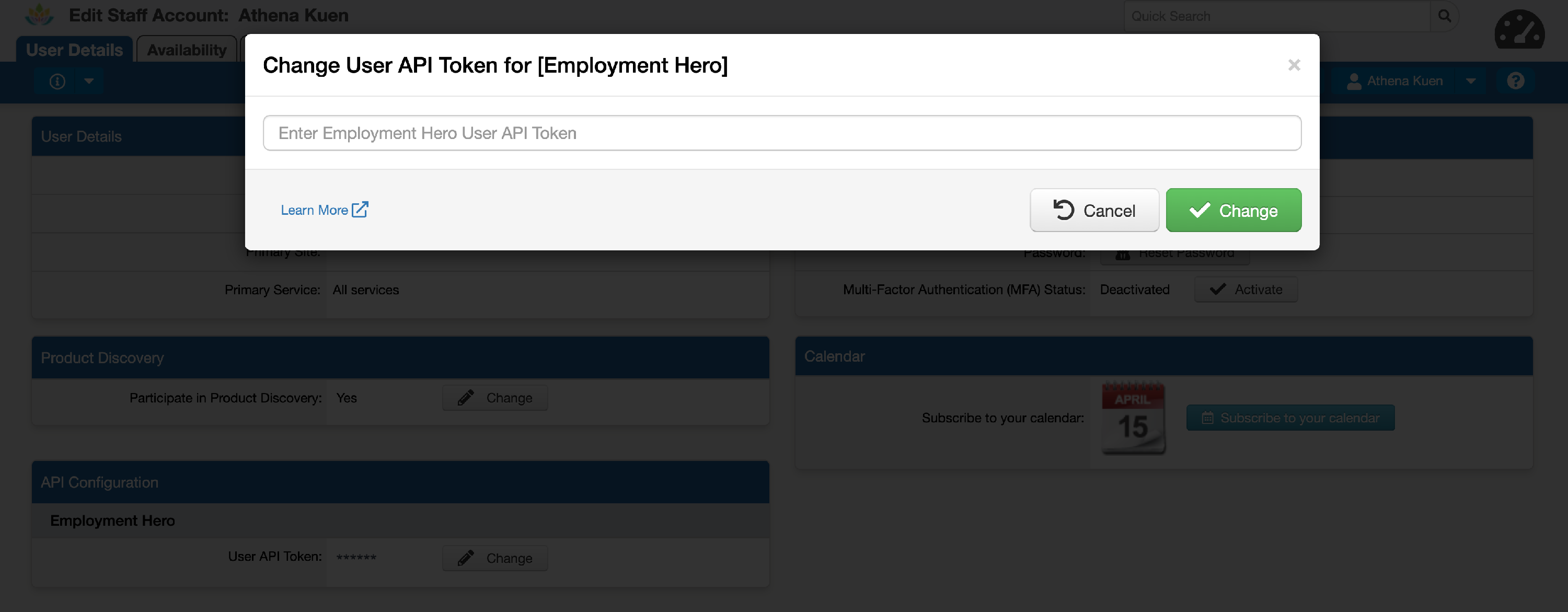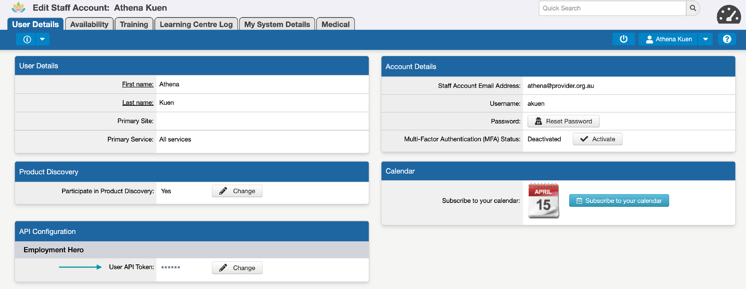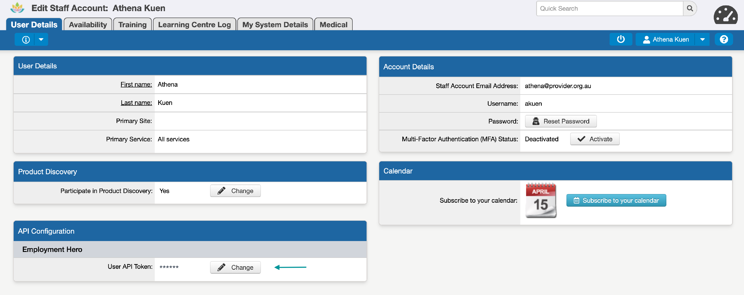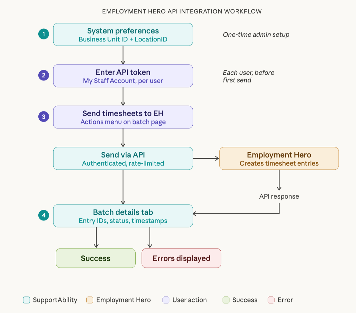 | Authentication error | The user's API Token is invalid or has expired | Generate a new API Key in Employment Hero and update the API Token in My Staff Account in SupportAbility |