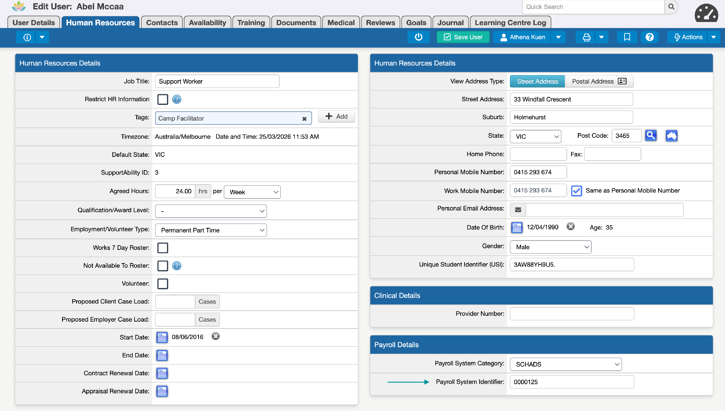 Each Staff member whose shifts are included in a Time Sheet Batch must have a Payroll System Identifier configured in the Human Resources tab of their Staff record, including your own for those who will be sending Timesheets to Employment Hero.