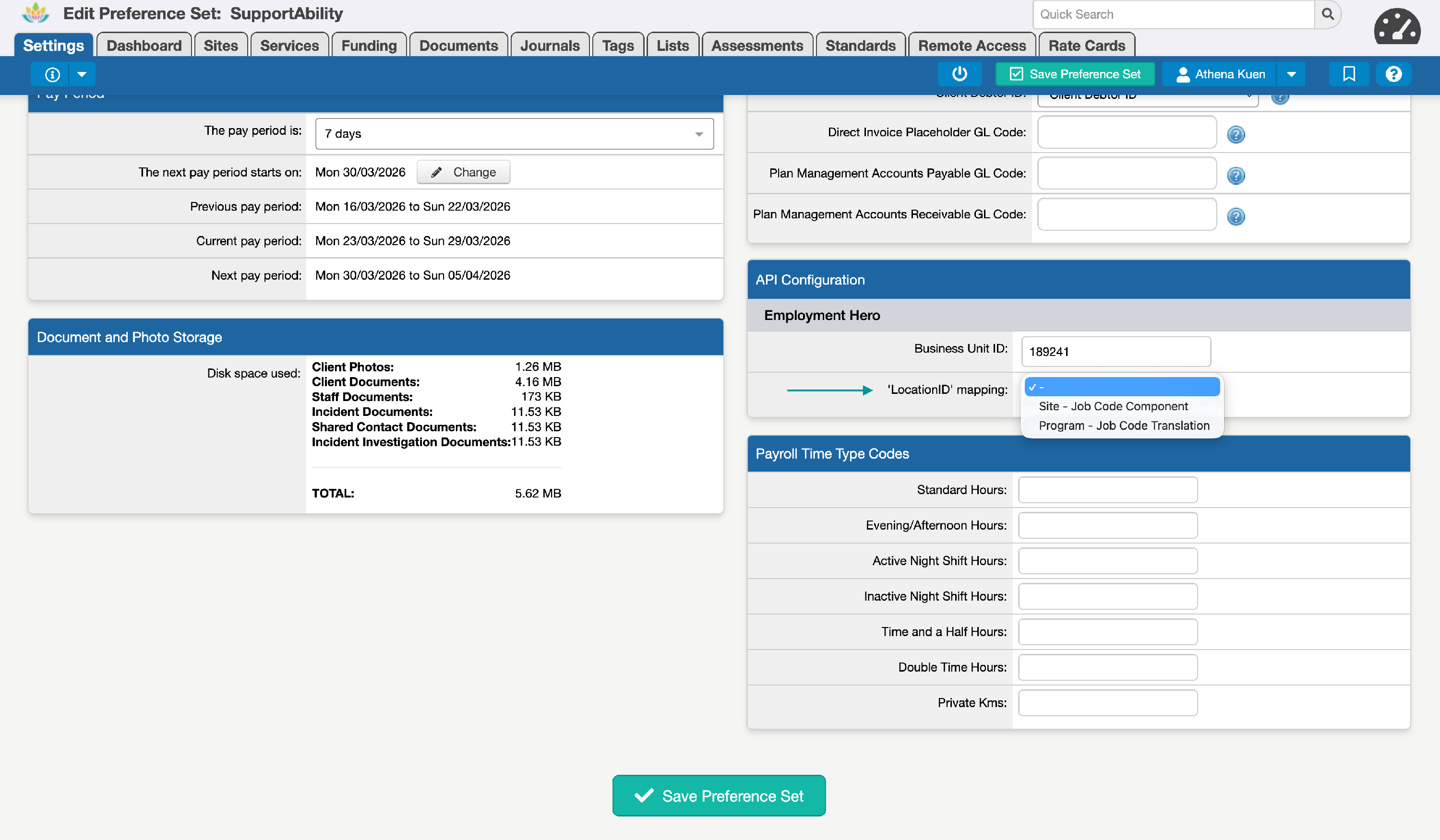 - Each user who needs to send Time Sheets generates an API Key in their Employment Hero account and enters it in My Staff Account in SupportAbility.