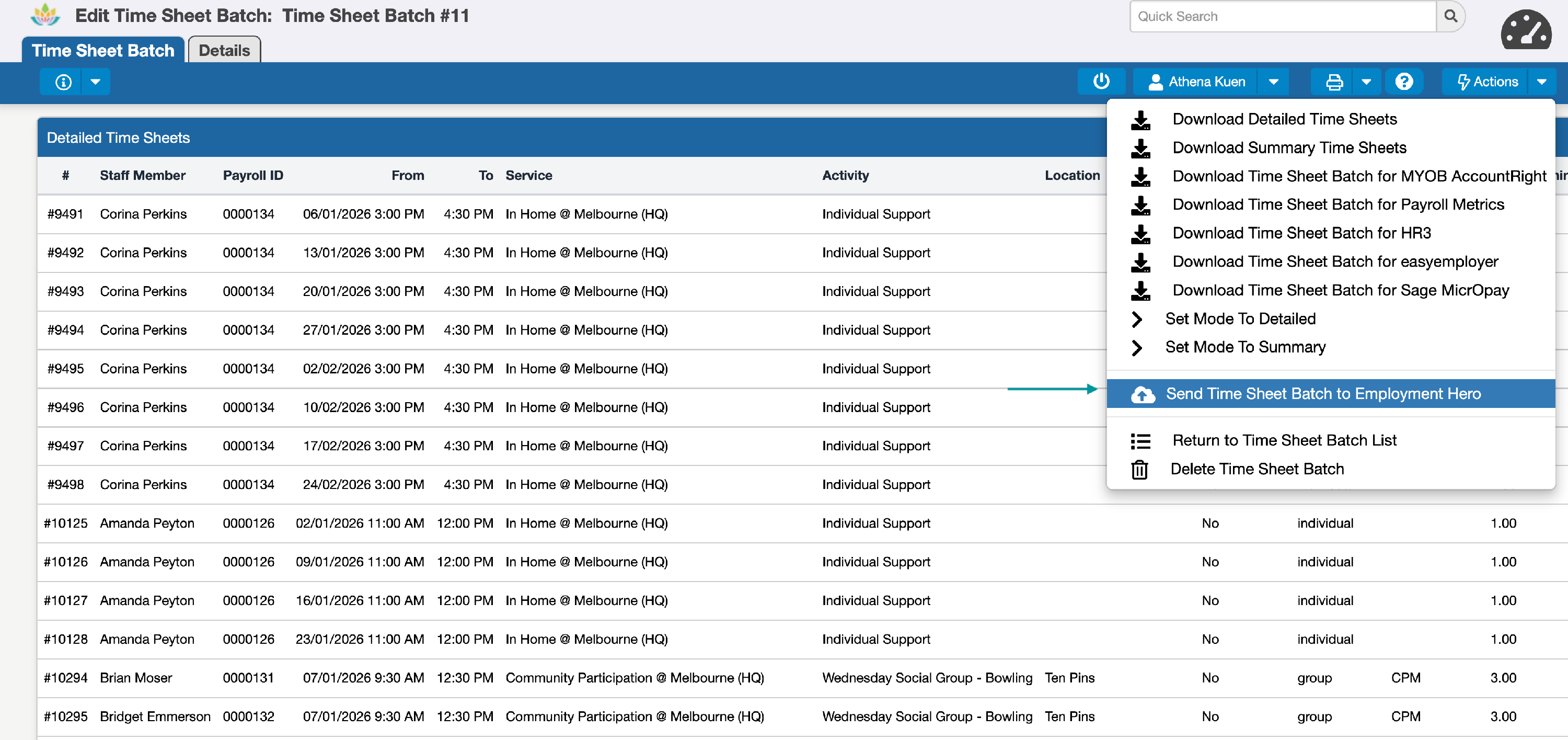 - When a Time Sheet Batch is ready, the user selects 'Send Timesheets to Employment Hero' from the Actions menu on the Edit Time Sheet Batch page.
