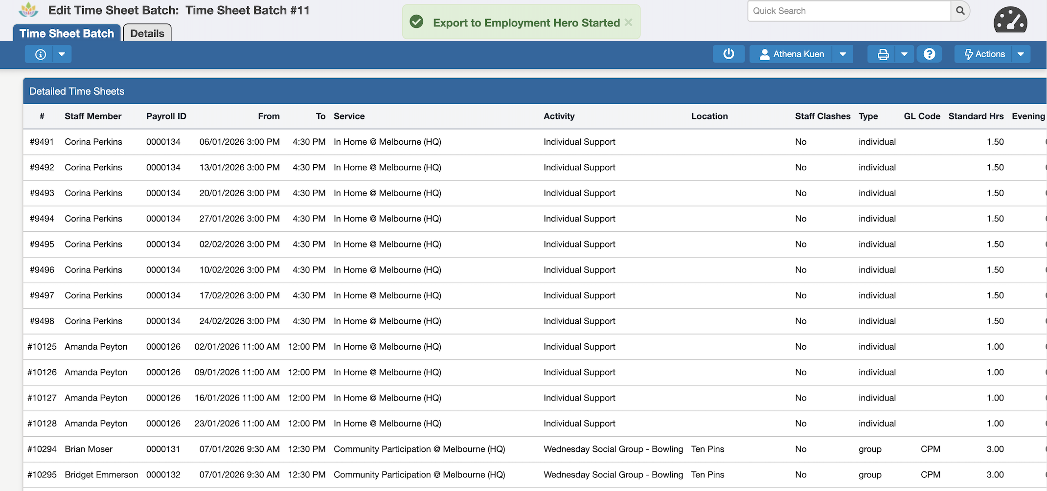 - SupportAbility sends the data to Employment Hero via the API and displays the results in a new 'Time Sheet Batch Details' tab.