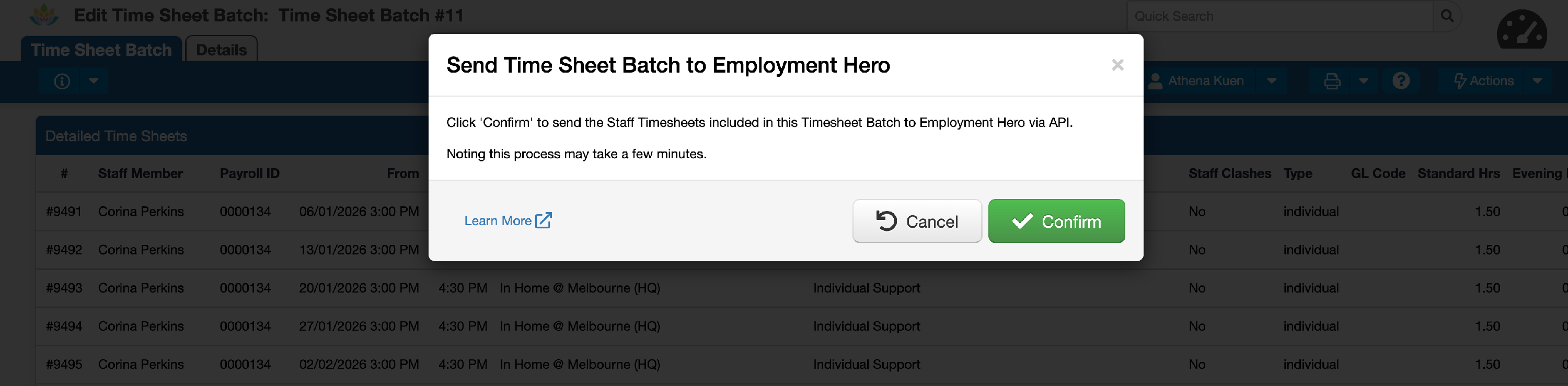 Once 'Confirm' is selected, SupportAbility will send the Timesheets included in the batch as separate Timesheet Entries to Employment Hero via the API in small sequential batches: